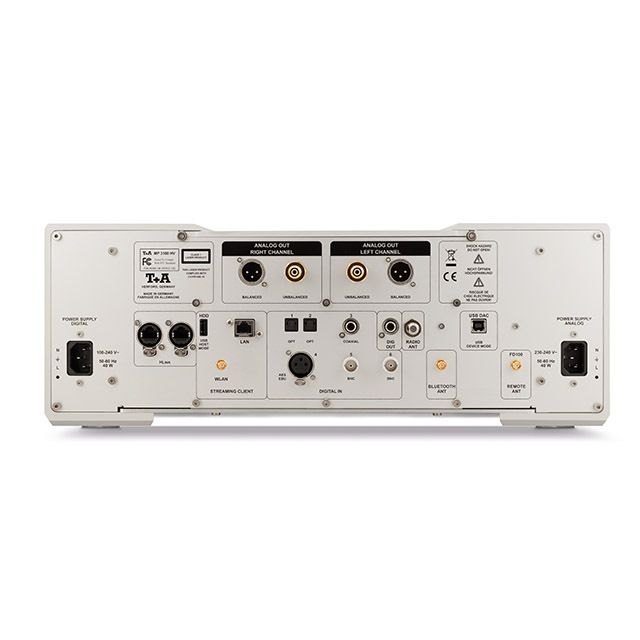 與MP 3000HV一樣,PCM數據透過我們傑出的轉換器用於所有數位訊號處理, DSD數據由PDP 3000HV獨特擬真1位元的DSD轉換器處理。如此就可以將DSD提升至DSD 512,達到最高音質水準。該型的串流端採用新型T+A的電路板,該電路板能提供最高分辨率,以使用各種音樂服務及網路電台廣播,透過LAN和WLAN加入家庭網路的設備。收音機提供FM,FM-HD和DAB +的功能並提供極佳的聲音。 MP 3100HV還擁有一個高品質的藍牙模組,用於播放行